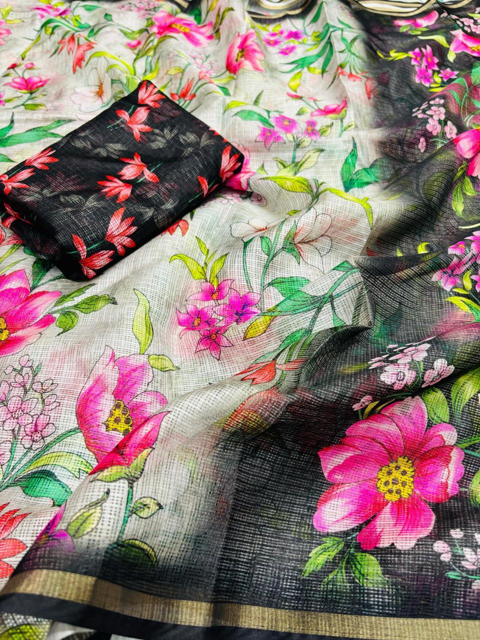 Fresh, vibrant, and full of festive charm—our Flora Fest Black Designer Saree is crafted from premium Kota Silk, offering an airy, lightweight drape with the classic woven checks texture. The saree features a lively mix of bold floral prints in shades of pink, green, and orange that beautifully complement the black base, creating a bright and elegant statement look.