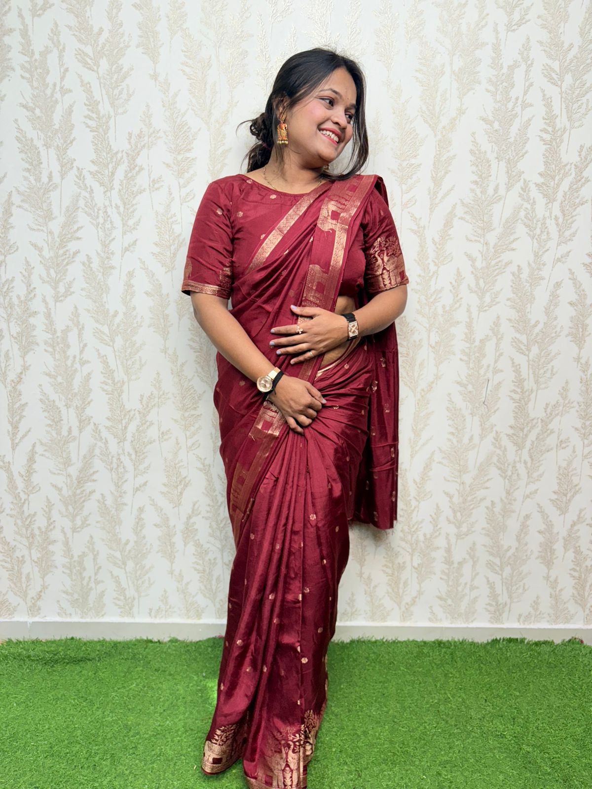 Step into timeless elegance with this Maroon color silk saree, beautifully highlighted by intricate zari butta’s and a grand twin elephant border motif under a tree. The rich hue combined with heritage-inspired weaving makes it a perfect choice for weddings, festive occasions, and cultural gatherings. Its graceful drape and luxurious finish embody sophistication with a touch of tradition.