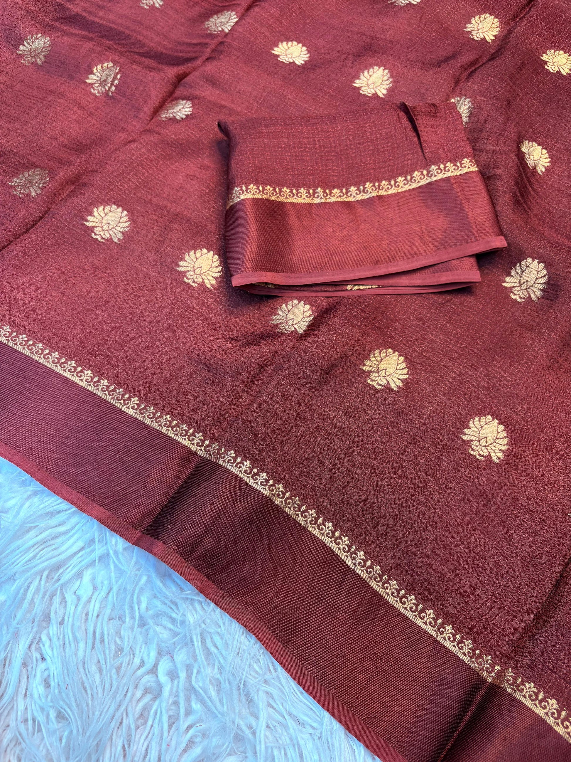 Graceful, refined, and beautifully traditional—the Maroon Aura Zari Weave Saree is crafted from premium Khadi Silk, offering a soft, textured drape with a rich ethnic feel. The saree features delicate gold zari buttas scattered elegantly across the vibrant deep maroon base, creating a charming festive glow.