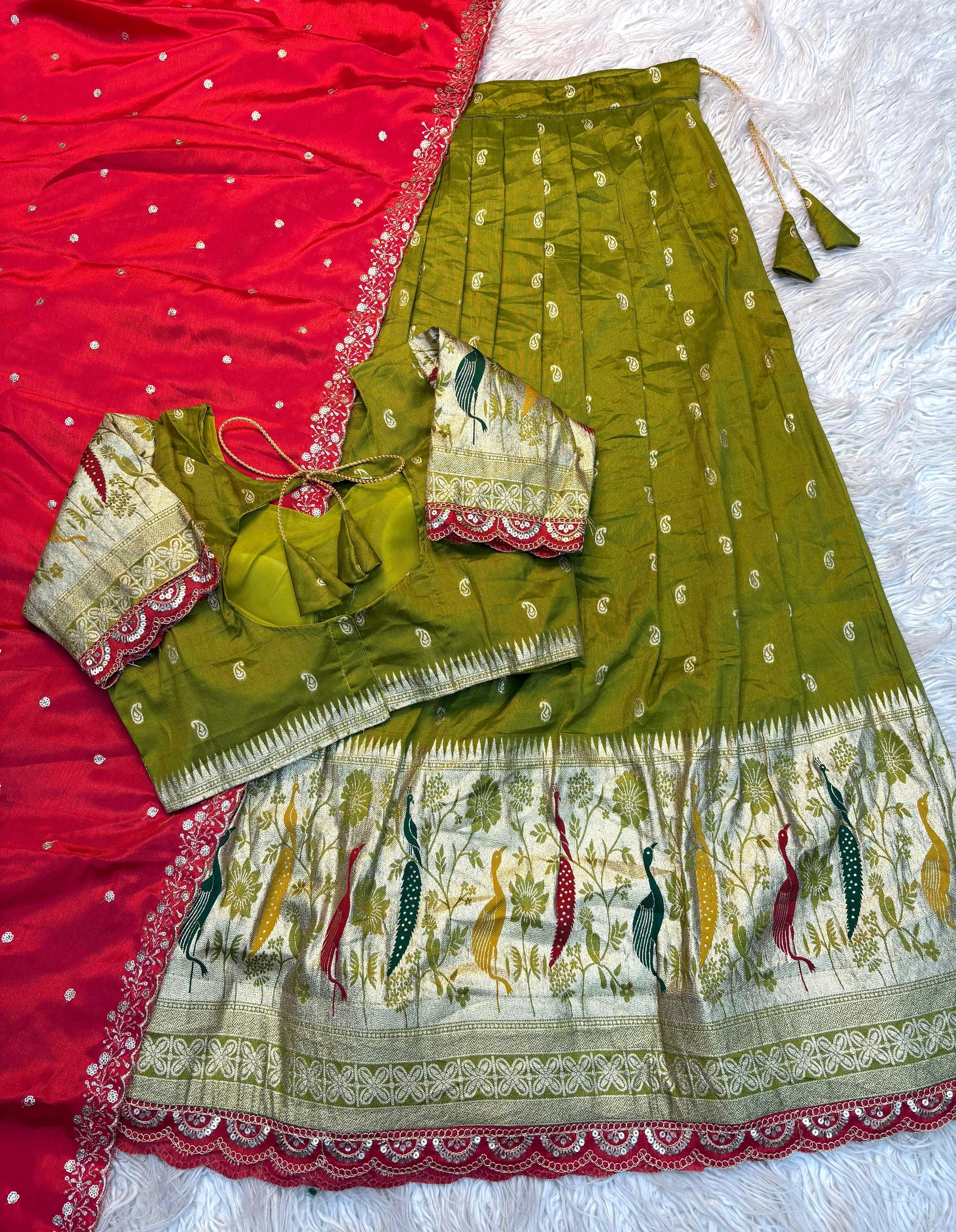 Graceful, vibrant, and undeniably royal — the Morbagh Parrot Green Zari Lehenga is crafted to turn heads. Made from soft viscose fabric with a subtle sheen, this lehenga is adorned with dainty golden butti weaving all over. The highlight is its beautiful multicolor peacock zari-woven border, inspired by traditional Indian Mor-Pankh artistry that symbolizes grace and beauty.
