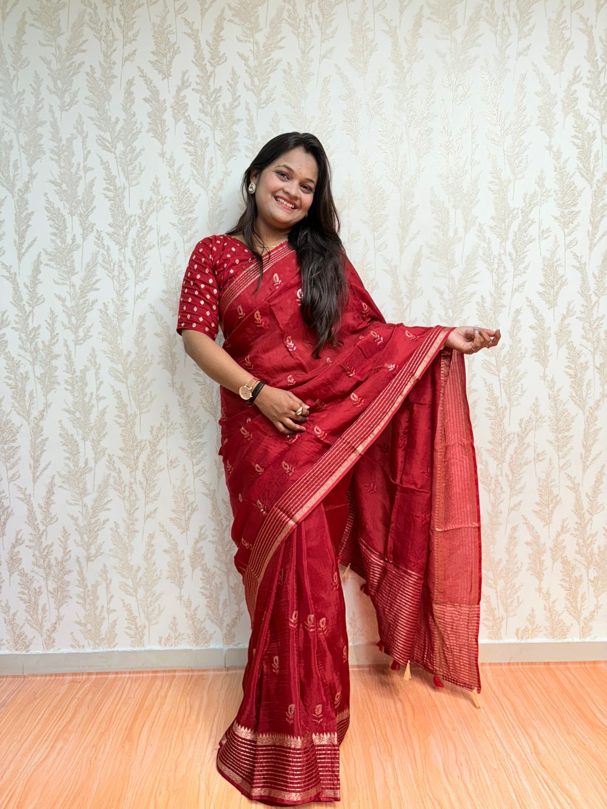 Introducing Scarlet Symphony, a stunning red viscose saree crafted with fine embroidery work that adds richness and detail to every inch. The soft, glossy viscose fabric drapes beautifully, while the golden zari border gives it the perfect festive glow.