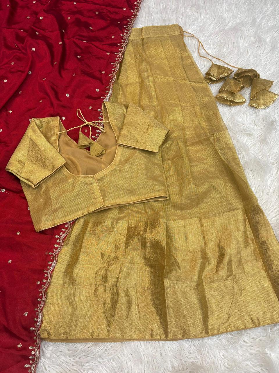 The matching blouse in viscose chex fabric enhances the coordinated look, designed with neat finishing and a back dori tie-up. Paired with a deep emerald red dupatta adorned with butti embroidery and scalloped lace, this outfit becomes the perfect pick for haldi, mehendi, festive pujas, and wedding functions.